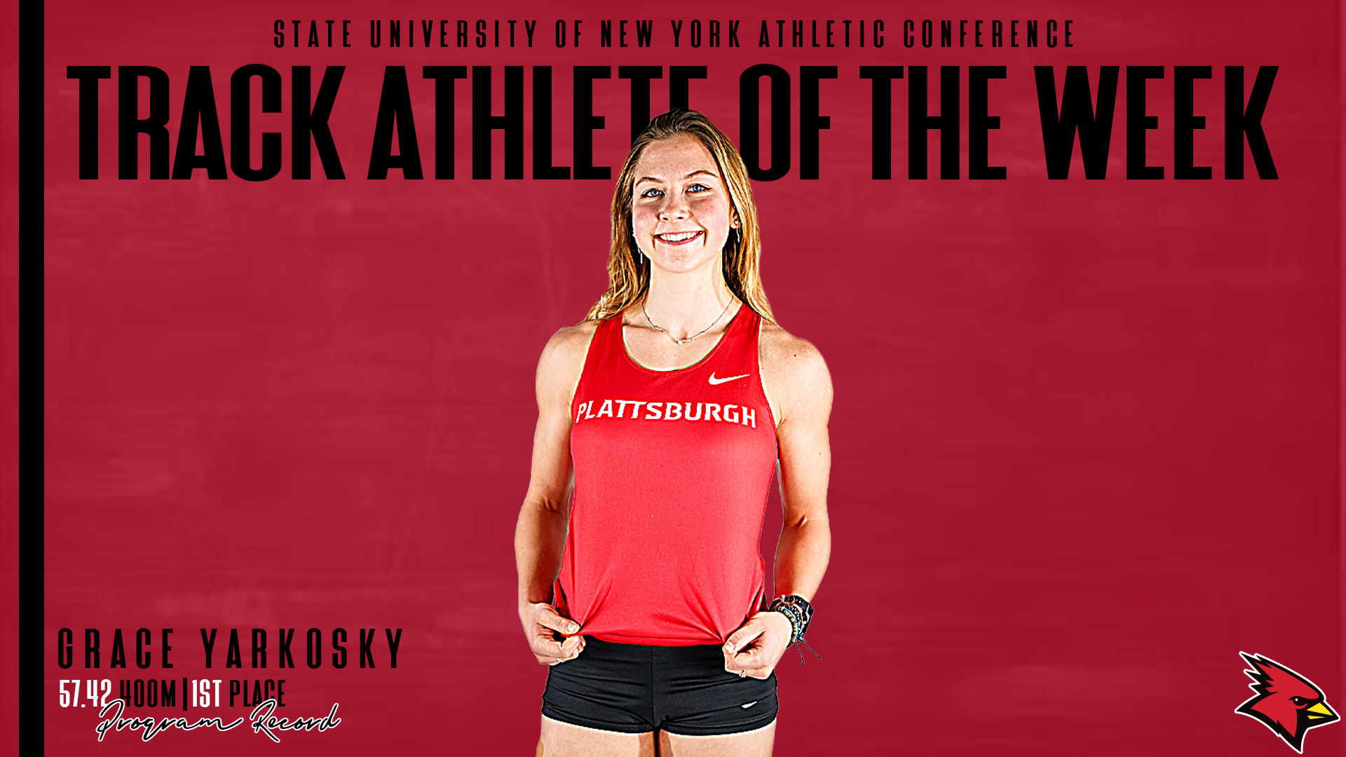 Plattsburgh was represented in the 60-meter dash by Deja Davis (Bronx, N.Y. / Paul Robeson), who placed eighth with a time of 8.70 seconds, earning one point for the Cardinals. In the 60-meter hurdles, Lexi McDonald (Altona, N.Y. / Northern Adirondack) finished first with a time of 10.16, earning ten points. Mikayla Khadijah (Cairo, N.Y. / Cairo-Durham) was fourth with a time of 10.71, earning five points, and Addison Burt (Liverpool, N.Y. / Liverpool) was fifth with a time of 10.88, earning four points.